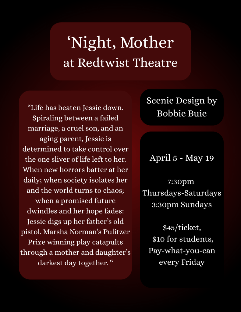 Bobbie Buie is a Chicago-based scenic and lighting designer. They graduated from Iowa State University in 2025 with a B.A. in Performing Arts and a B.A. in English. Recent credits includes design work at Hope Repertory Theatre, Story Theater Company, and Iowa Stage Theatre Company. Recent accolades include The Cloris Leachman Excellence in Scenic Design nomination for Torch Song with Iowa Stage Theatre Company, and the Kennedy Center American College Theatre Festival National Scenic Design Award for Always Plenty of Light at the All Night Starlight Diner at Iowa State University, directed by Heather Currie. They also freelance across Chicagoland as a carpenter, electrician, and scenic artist. In their free time, they enjoy creative writing, bird watching, and craft beer.